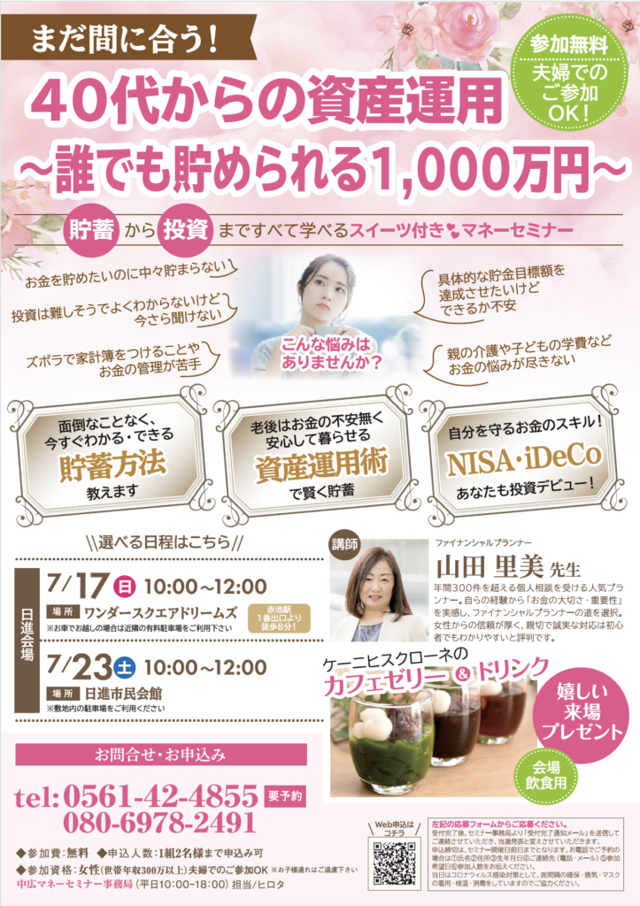 2022年7月17日(日)・23日(土)の2日間、愛知県日進市にて「まだ間に合う!40代からの資産運用〜誰でも貯められる1,000万円〜」を開催しました。夫婦でのご参加もOKの人気セミナーです。