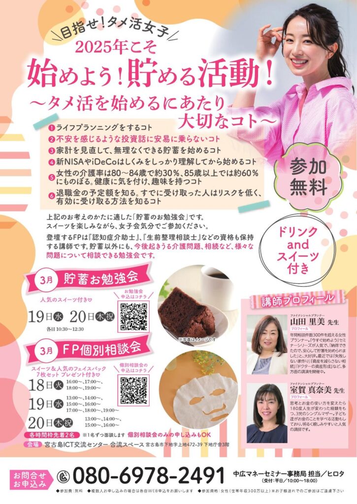 2025年3月19日(水)・20日(木祝)の2日間、沖縄県宮古島市の宮古島ICT交流センター 合流スペースにて、「2025年こそ始めよう!貯める活動!〜タメ活を始めるにあたり大切なコト〜」を開催しました。スイーツを楽しみながら、女子会気分でご参加いただける貯蓄お勉強会です。